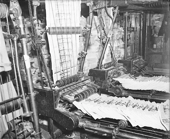 Image credits: (top) The Kept Newspaper in Puck (1907). Samuel D. Ehrhart, Illustrator. Library of Congress. (bottom) Newspapers Coming off of the Press (1936). Harris & Ewing, photographer. Library of Congress.